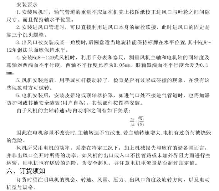 一、風機選用參考、安裝維護使用說明、常見故障分析、訂貨注意事項